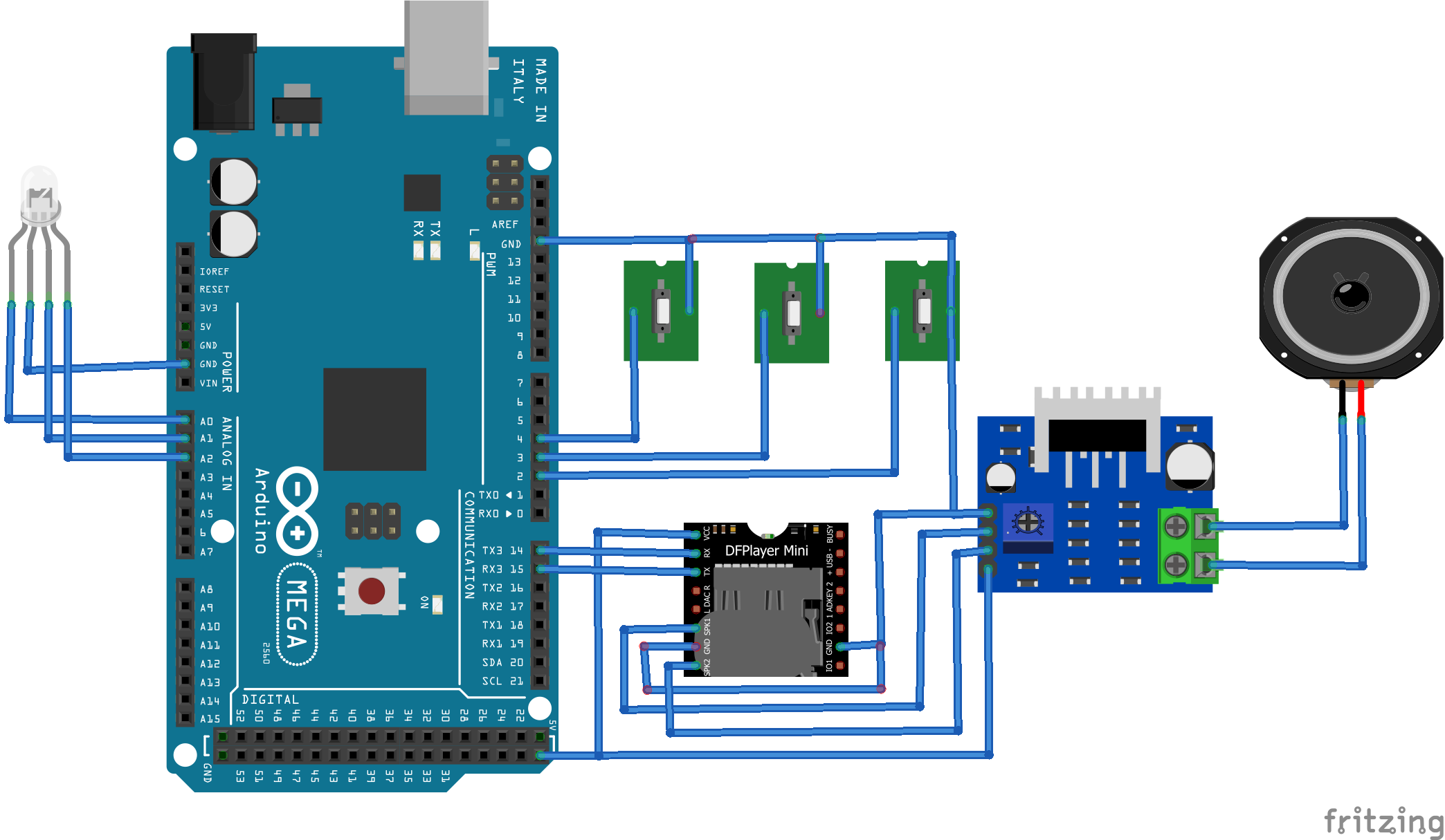 - In the setup() function, the RGB LED pins are configured as output, while the button pins are set as input. Serial communication with the DF Player Mini is initialized, and a command to play the first track is sent to start the playback sequence.