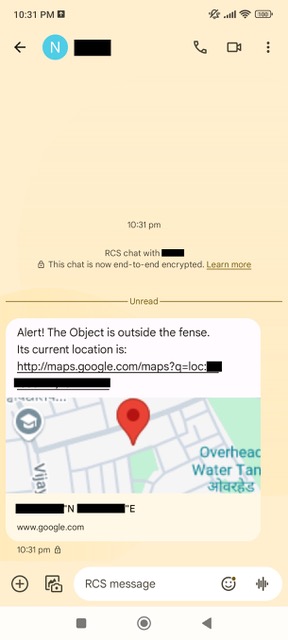 For this project, we configured the fixed reference location in the sketch with the GPS coordinates of our city — approximately 12 kilometers from our current position. Since the distance between the reference location and our current position far exceeded the geofence radius of 50 meters, the device triggered an SMS alert. The alert was sent to the registered mobile number, providing our current location as follows.