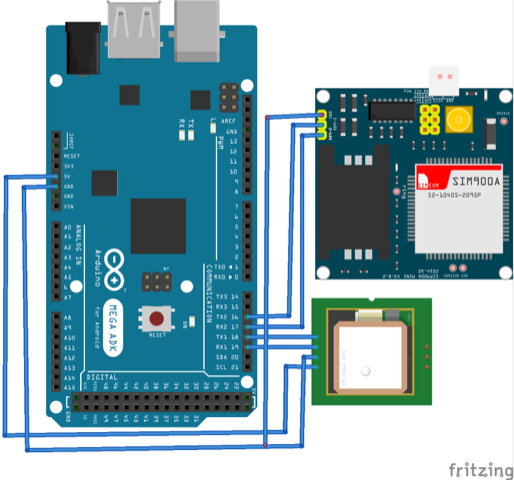 To build this geofencing device, you’ll need to connect a SIM900A GSM/GPRS modem and a Neo-6M GPS module to an Arduino board. We’ve chosen Arduino Mega becuase it includes multiple hardware UART ports, but other Arduino boards can also be used. However, they might require software serial for communication.