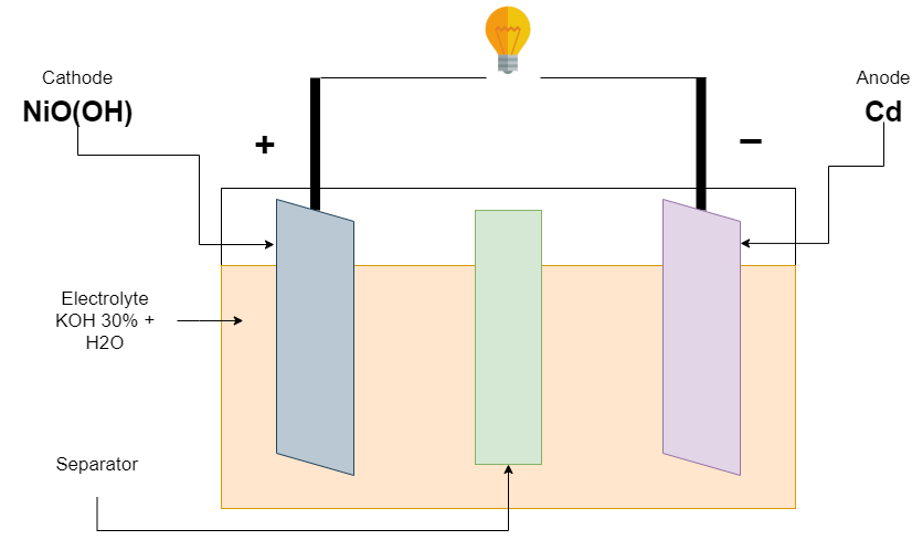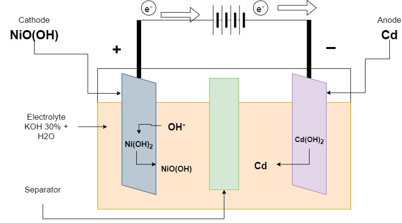 Firstly, the Ni-Cd battery is invented in 1899 by Waldermar Jungner. its positive electrode (Cathode) made of nickel oxide hydroxide (NiO(OH)), and a negative electrode (anode) made of Metallic cadmium (Cd). The electrolyte used is 30 percent potassium hydroxide (KOH) in distilled water. The electrolyte level maintained just above the top of the electrode. There are no appreciable changes that occur in the electrolyte during charging and discharging.