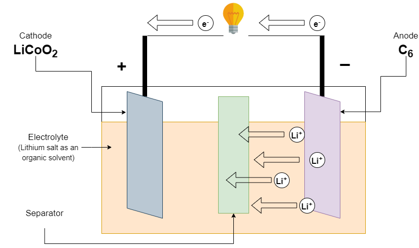 At the time of discharge of the battery, the Load is connected to the terminal battery. The lithium-ion is released from the negative electrode and travels to the electrolyte. This lithium-ion is absorbed by a positive electrode. The negative electrode also releases the electrons which travel through an external wire to the positive electrode. This provides us with an electric current to our circuit.