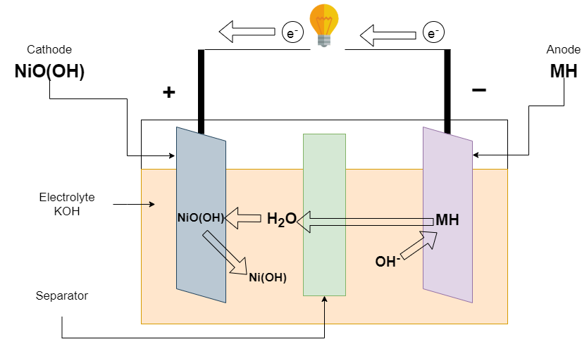 The reaction of discharging begins when the load is connected at terminals. The Metal hydride (MH) reacts with OH ions to form M and water, and also releases an electron. The electron is taken by NiO(OH) through an external load. This causes electricity to flow through the load.