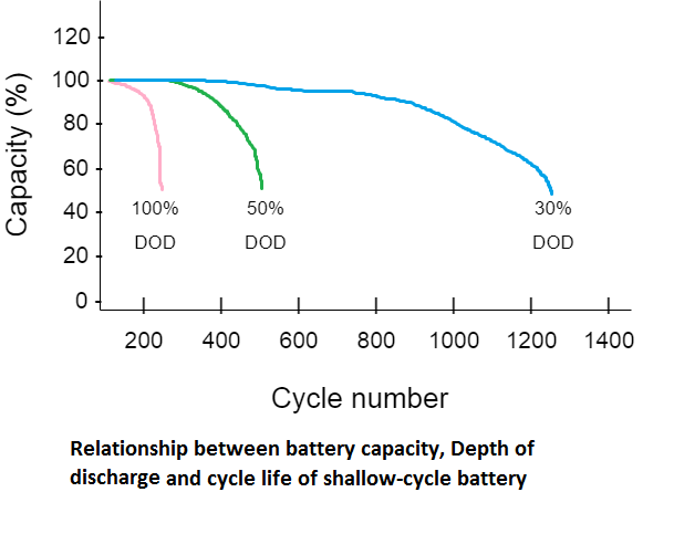 There are two types according to DOD of battery, battery which has DOD capability of more than 50 % is called Deep cycle battery, and battery which cut off before 50 % of DOD is called shallow cycle battery. The deep cycle battery able to maintain a life cycle of around 1000 even if the Depth of discharge is more than 50 %, but the shallow cycle battery can very their life cycle as graph given below.