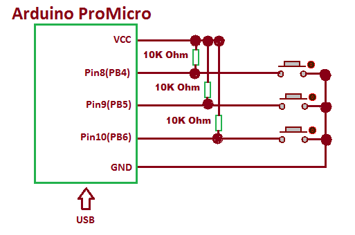 The project uses Arduino Pro Micro as the USB controller chip. A set of three tactile switches are connected at the port B of the Arduino. The switches are connected at pins 4, 5 and 6 of the port B with functions assigned to them according to the following table – :