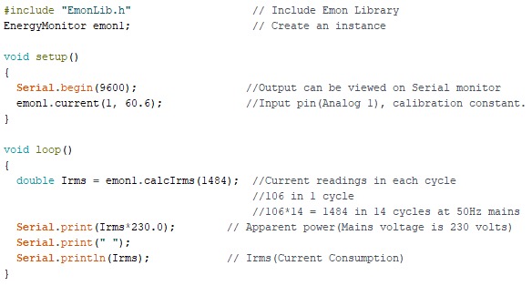 In the loop function emon1.calcIrms(1484) statement is calculating the current. In each input power cycle (50Hz), 106 instances of current are read by the Emon library. For better precision, I want to grab current instances for 14 cycles which are equal to 1484. Finally, the Irms variable is used to store the result. Once current is known, apparent power can be calculated by multiplying current with 230 mains voltage.