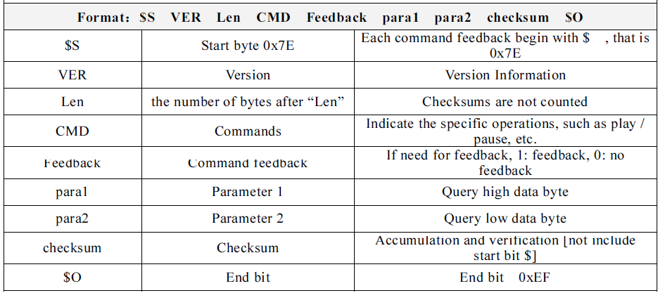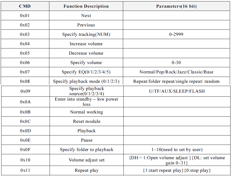 The implementable command in the 10-byte packet is the 4th byte. The command may require additional parameters, which are sent via the 6th and 7th bytes in the packet. The commands that can be directly forwarded to the DFPlayer module are listed below.