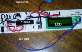 This project involves various stuffs like accelerometer module, 8 bit ADC, 555 timer IC, LCD display etc. So I’ll be discussing about all of them step by step. First let’s talk about the Accelerometer IC; here I have used ADXL_335 which is a 3-axis accelerometer module. This module provides X, Y and Z axis data.