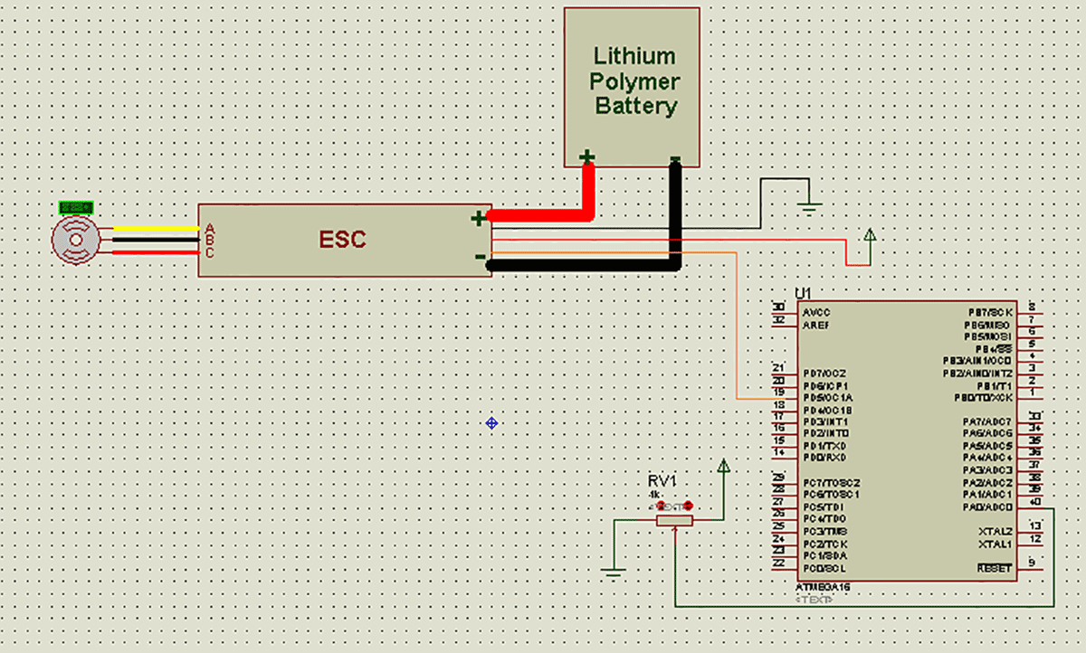 Now when we talk about controlling these motors I would like to introduce a new term, i.e. ESC which stands for Electronic Speed Controllers. As the name suggests, they control the speed of brushless DC motors using some electronic protocol. These ESCs need a command to work further. In this project I’m sending these commands using a microcontroller, AtMega 16. You might be thinking what these command could be? Don’t worry, if you have ever dealt with servo motors before, you’ll be able to control these BLDC motors very easily. Most of the ESCs need a 50Hz frequency i.e. a 20 ms cycle and the speed depends upon the duty cycle you provide. 1ms will reduce its speed to minimum or even stop it (it depend upon the ESC model) while a 2ms pulse will run the motor on its full speed. The values between them give you a variation in speed.