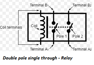 double pole single through relay is best choice here. A double pole single through relay has a single coil and double channels. When coil is energized two contacts are instantly made. Since two contacts are made. Battery both positive and negative terminals can be connected to this relay for input. A typical foot print of DPST relay is shown on the right hand side. Normally both the terminals are open and upon coil activation both the poles moves and completes the circuit line through which electric power can flow now.