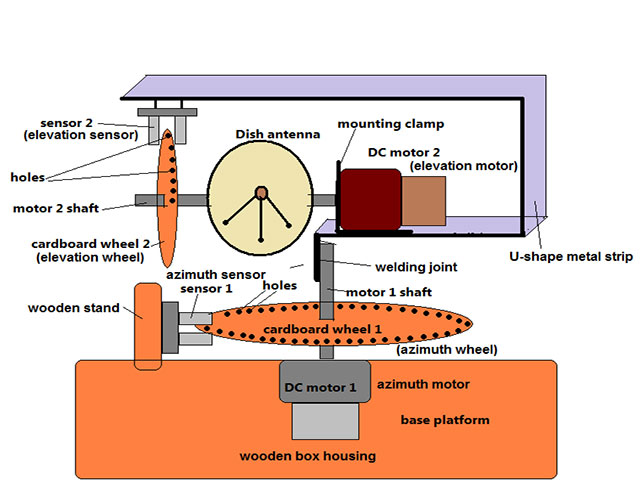 The above figure shows a diagram of the system. The azimuth motor (AZ motor) and elevation motor (EL motor) are shown. The sensors are attached with shafts of the antenna as the dish antenna changes its position, the analog output from the sensor changes.