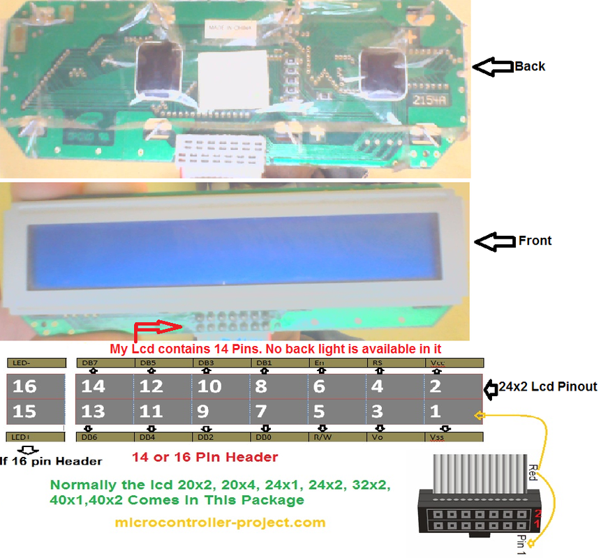 In this post i am going to explain how to interface 24×2 lcd with microcontroller. I am going to interface lcd with 8051(89c51,89c52) and Microchip Pic16f877 microcontrollers. 24×2 means 24-Coulombs and 2-Rows. Total characters which we can display on 24×2 lcd (24×2=48) 48. 24 Characters on each row. Interfacing 24×2 lcd with microcontroller is same as we interface other character lcds with microcontrollers. 24×2 lcds are controlled by hd44780 controller, the same controller used to control 8×1,16×2,20×2 lcds. Commands to initialize 24×2 lcd are same used to initialize other character lcds. Registers of lcd are also same. Data read and write process is also same.