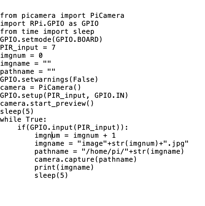 An infinite loop is run to capture images of any movement outside the door. If the PIR sensor detects any motion, it gives an output of logical HIGH. If the output of the PIR sensor is HIGH, the image number is increased by 1 and is concatenated to string “image” in variable ‘imagename’. The image name is appended to a file path in variable ‘pathname’. The image of the outside is captured with the updated file location using the capture() method. The new image name is logged to the console using the print() function. A delay of 5 seconds is provided after an image has been captured.