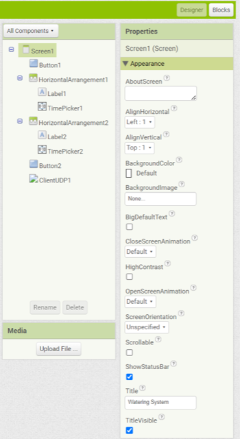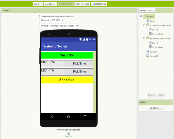 The mobile app is the heart of this project and is built in the MIT App Inventor. It lets users switch ON/OFF the motor/valve or schedule its operation.