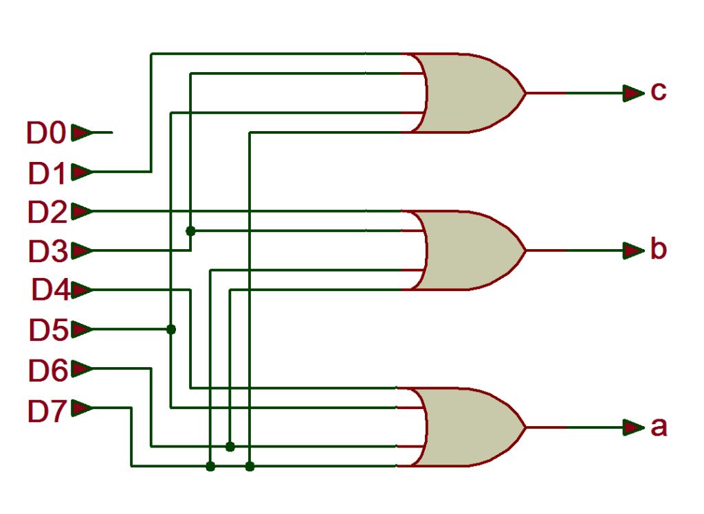 In the encoder example, when D7’s input is ‘1,’ the outputs are ‘a = 1,’ ‘b=1,’ and ‘c=1.’ You can verify other combinations based on the truth table.