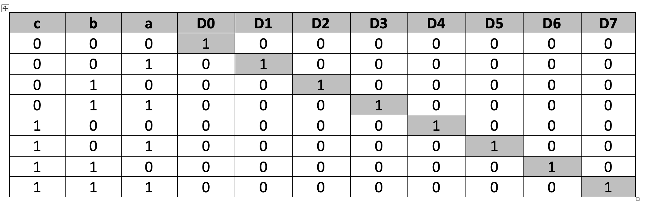 Be sure to verify the D0-D7 output. You’ll note that only one output is high at a time. All of the others are then low, as per the given input A0-A1-A2 combinations from ‘000’ to ‘111.’