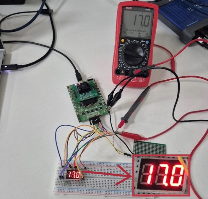 Therefore, when the ADC measures a certain voltage value, the described comparison will point to the corresponding voltage value stored in the Memory Table – 3 consecutively recorded digits, which will dynamically be displayed on the 7-segment display.