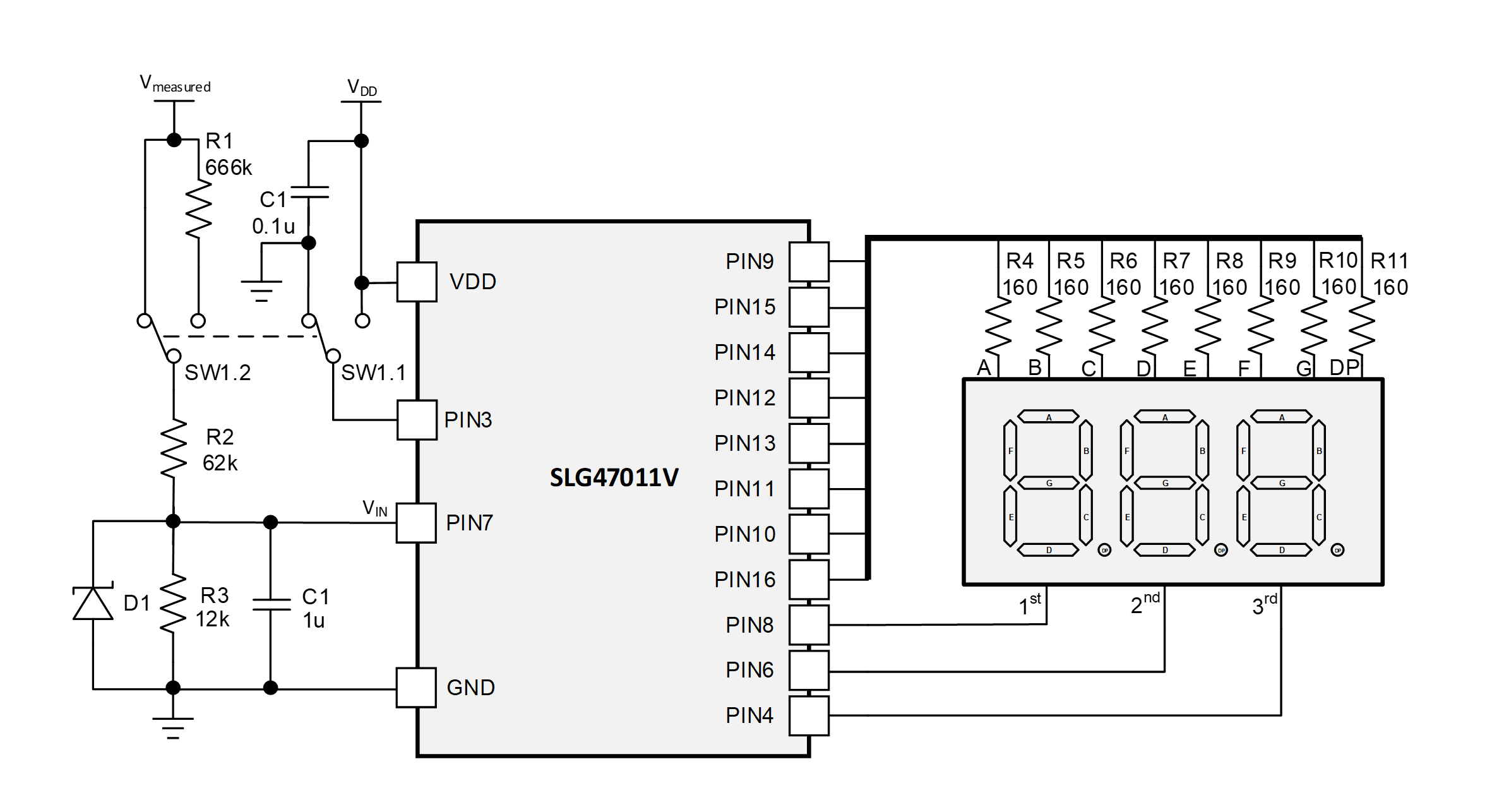 The VIN voltage is applied to PIN 7 through a resistive divider 62 kΩ / 728 kΩ (666 kΩ + 62 kΩ) and 12 kΩ depending on the position of switch SW1. SW1 also affects the maximum allowable voltage (Vmeasured) and decimal point (DP) position.