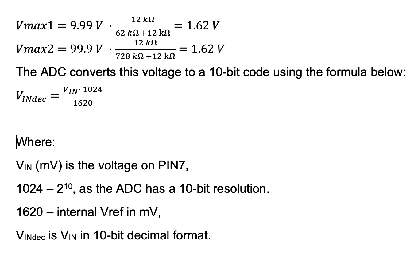 The signal from PIN 7 then goes to the single-ended input of the PGA (buffer mode, mode #6) and then to ADC CH0 for further sampling. The maximum allowable voltage before the resistive divider, Vmeasured, is 9.99 V when the resistance of 62 kΩ is selected, and 99.9 V when 728 kΩ is selected.