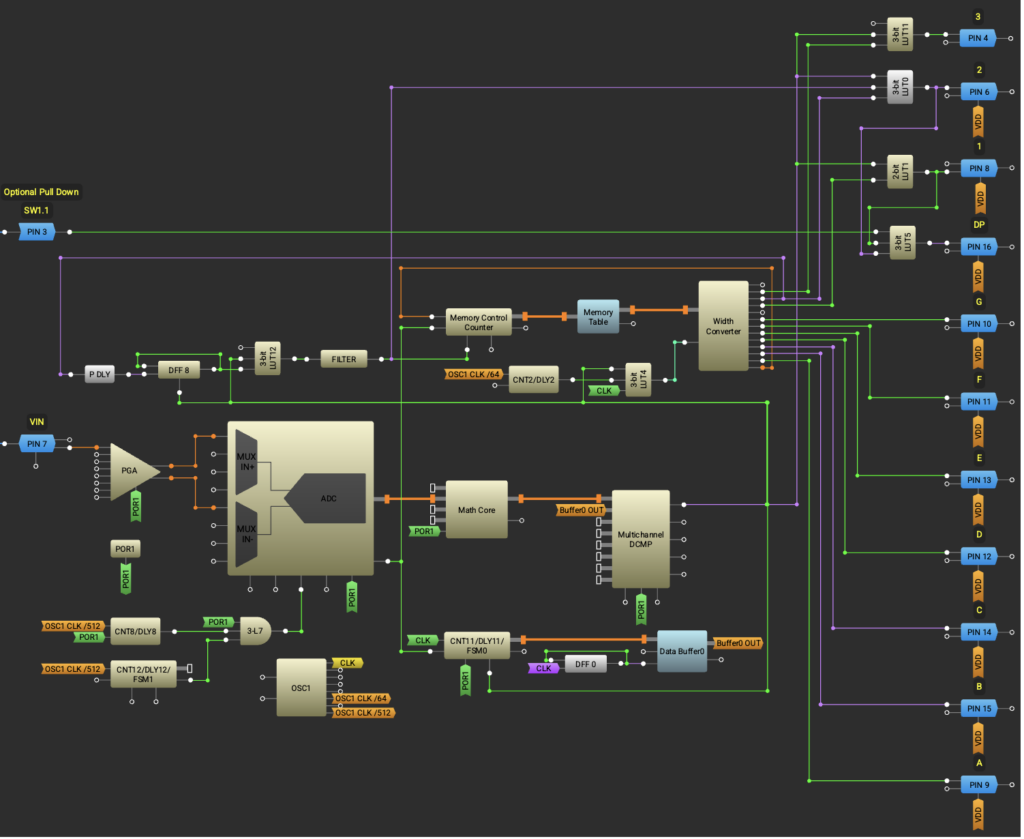SLG47011 includes a Memory Table macrocell that can hold 4096 12-bit words. This space is enough to store the value of each of the three indicator digits for each VINdec – 1024 x 3 = 3072 values in total. In other words, the “3n” word of the Memory Table corresponds to the 1st digit, the “3n + 1” word corresponds to the 2nd digit, and the “3n + 2” word corresponds to the 3rd digit of the corresponding Vmeasured. Where n = VINdec.