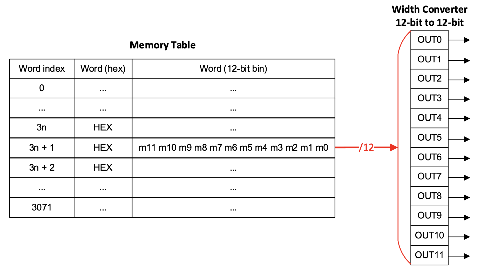 The required values for the Memory Table are already determined; now, they need to be sorted in ascending order of the Word index and inserted into the appropriate location in the software. For a better understanding of the connections between the Memory Table and the Width Converter, see Figure 3.