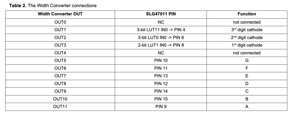 In the case of a design where a decimal point is only needed after the first or second digit, the 8th bit (m4) “decimal point” value can be written, and the corresponding Width Converter output, which is connected to PIN 16. Since decimal point logic is currently activated using the logic based on the states of the 1st and the 2nd digits and the switch (PIN 3), this bit can be written 0 or 1 without any difference, since it is not connected.