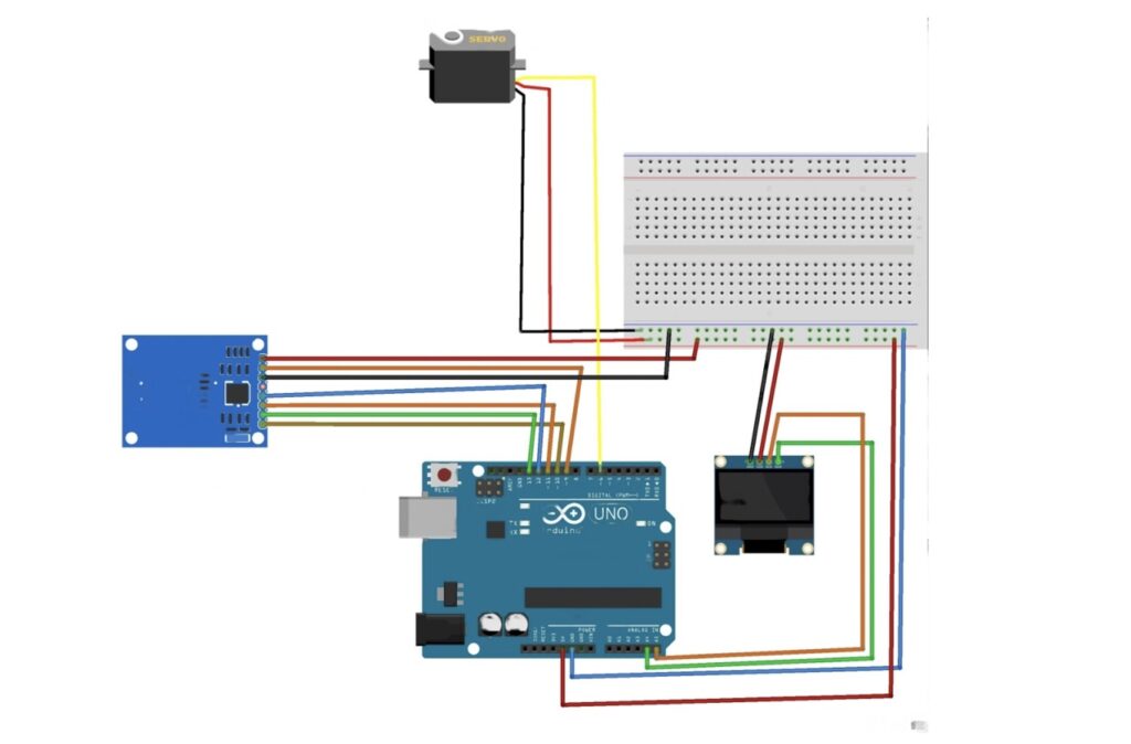 Begin by connecting the RFID reader module to Arduino UNO using the jumper wires. Ensure the breadboard’s power rails are connected to Arduino’s power and ground pins. The servo’s 5V must also connect with the OLED and RFID.