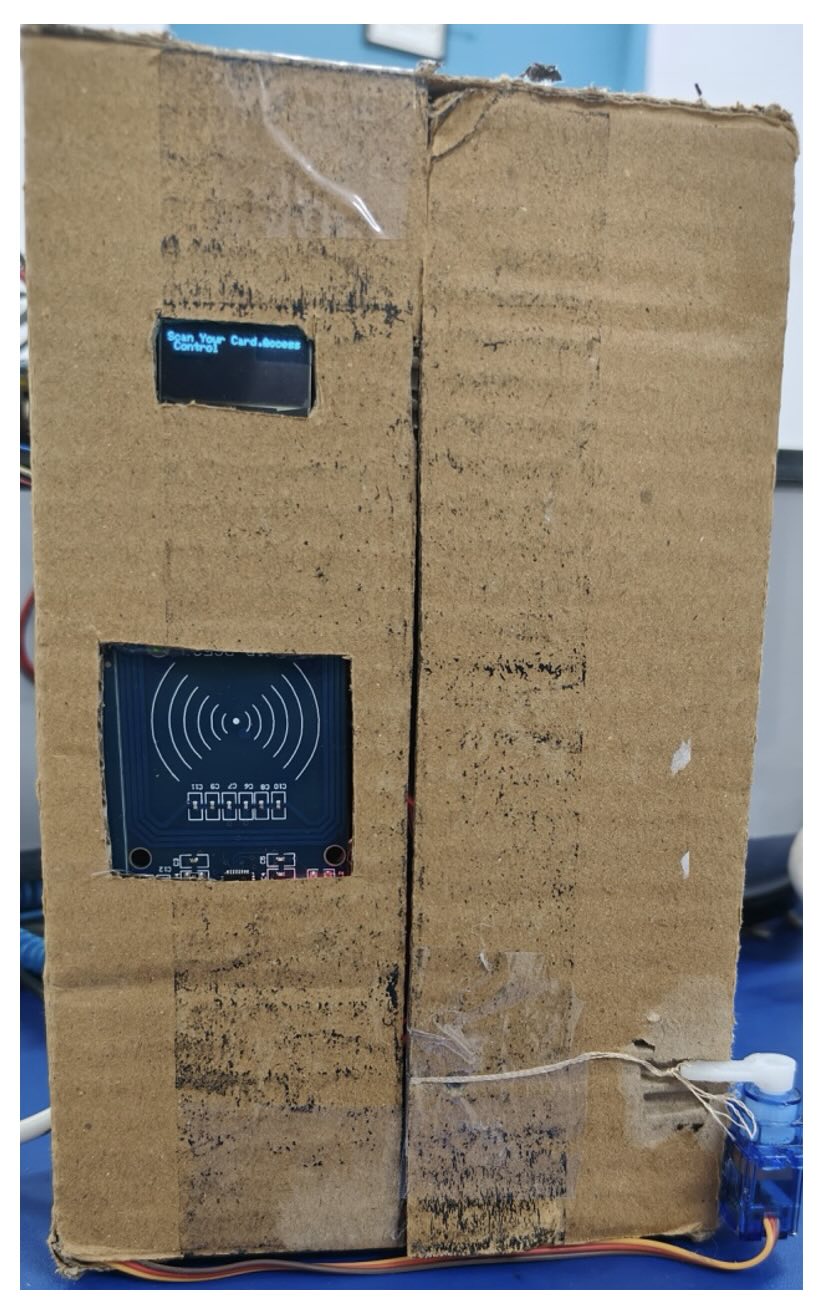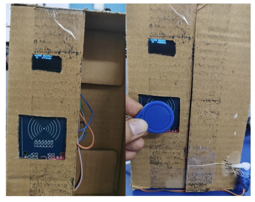 The RFID reader scans a unique tag, and if it matches a pre-registered one, the servo motor unlocks the door. However, the servo motor remains inactive if an unregistered tag is scanned. The servo’s shaft is mechanically connected to a door, allowing it to open and close within a predefined time frame.