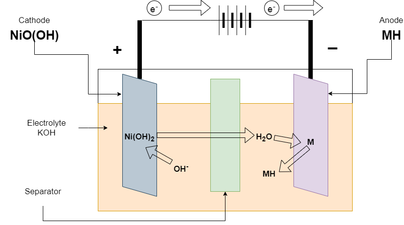 At the time of charging, the charger is connected at the terminal of the battery the reactions of charging are reverse from discharging reactions. The positive electrode converts Ni(OH)2 to form NiOOH, water and releases an electron. This electron is taken by the negative electrode from the external wire and it from MH again.