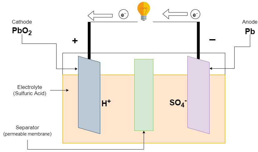 When the battery is connected to a load, The battery begins to discharge. The sulfuric acid (H2SO4) breaks into two parts hydrogen (2H++) ions and sulfate ions (SO4— ). The hydrogen ion takes an electron from the positive electron and sulfate ions give an electron to the negative plate. This inequality of electron cause flow of current at external load to balance the inequality of electrode.