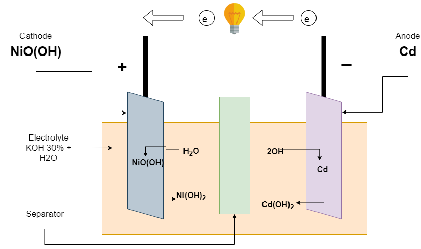 Firstly, the Ni-Cd battery is invented in 1899 by Waldermar Jungner. its positive electrode (Cathode) made of nickel oxide hydroxide (NiO(OH)), and a negative electrode (anode) made of Metallic cadmium (Cd). The electrolyte used is 30 percent potassium hydroxide (KOH) in distilled water. The electrolyte level maintained just above the top of the electrode. There are no appreciable changes that occur in the electrolyte during charging and discharging.