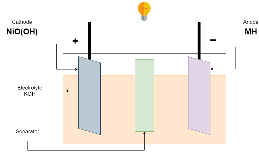Firstly, the Ni-MH battery is invented in 1967 by Battelle-Geneva Research Center. Then it introduced in 2005 by Sanyo, branded Eneloop. In this battery positive electrode (cathode) made of nickel oxide hydroxide and a negative electrode made of hydrogen-absorbing alloy (Metal hydride). The electrolyte used is potassium hydroxide (KOH) concentrated with distilled water.