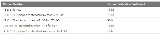 CT and burden resistance are not accurate; there is some margin of error. Emon specified the formula and default calibration values for known resistances and CT to cover up this margin of error. In our case, we used 33-ohm burden resistance, CT max input is 1000A and output 50mA. Calibrated value can be calculated using the formula below.