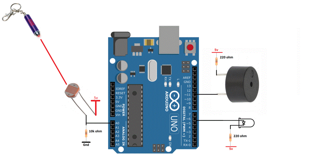 Arduino buzzer one leg is connected to arduino pin#11 and the other is pulled high. Led positive leg is connected to arduino pin#6 and the other end is pulled high. 5 volts supplied to buzzer and led can be from the arduino 5v pin. 220 ohm resistor in series with the buzzer and led is used for current limiting purpose.