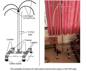 To build the tree structure, we’ll use 1-inch diameter PVC pipes, as well as L- and T-joints. These joints are used for the tree’s base stand. The leaves are made of medium-thick 1mm2 copper wire.