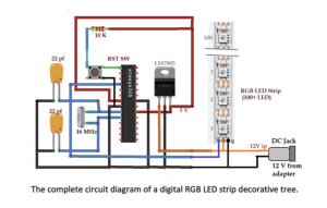 The RGB LED strip is cut and arranged to form the shape of a coconut tree. The ATMega328 microcontroller is used to control the LED strip, generating several flashing, fading, and blinking LED effects. Much like a light show, more than 15 different multicolour effects will run continuously.