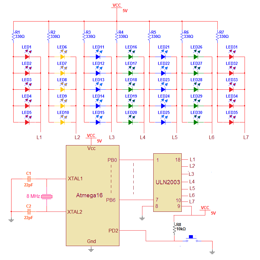 As shown in figure 5 same colour LEDs are connected in parallel that will make one bunch. There are 7 such LED bunches each of 5 LEDs so total 35 LEDs.