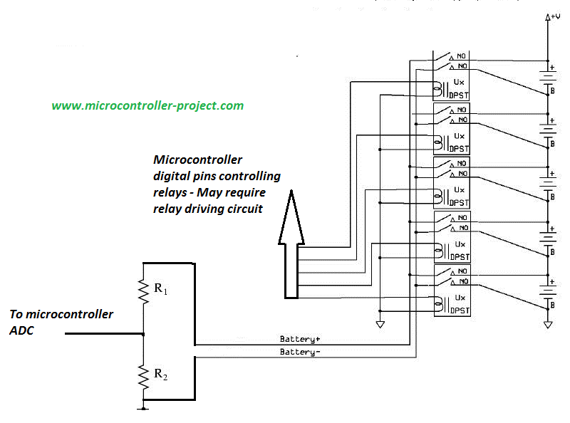 - Only one analog channel of microcontroller is required to measure multiple batteries.