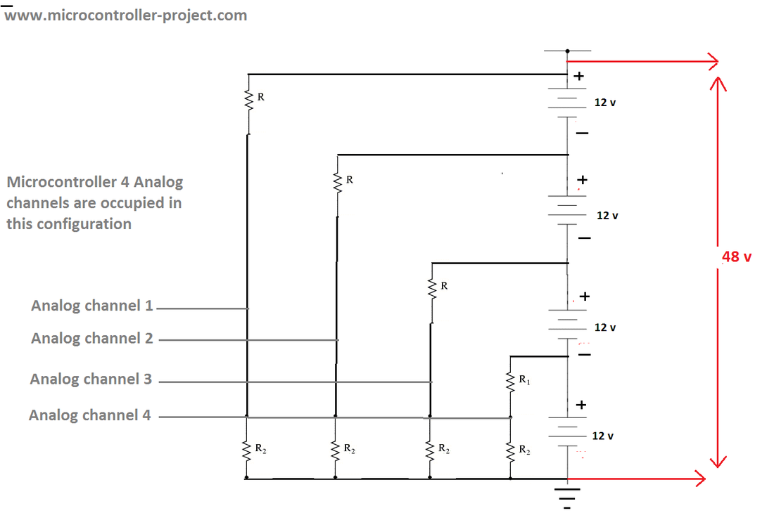 In the above scenario for each battery their must be a dedicated analog channel. For higher string of batteries more analog channels are required and microcontrollers usually have 8 analog channels at max. So this method is feasible only when batteries in series combination are not greater than 4.