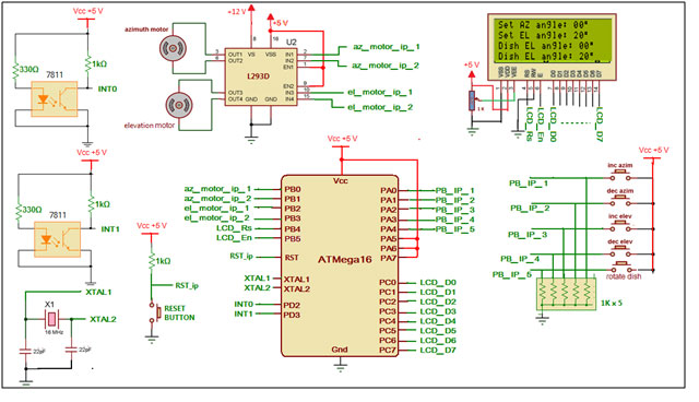 The above figure shows a diagram of the system. The azimuth motor (AZ motor) and elevation motor (EL motor) are shown. The sensors are attached with shafts of the antenna as the dish antenna changes its position, the analog output from the sensor changes.