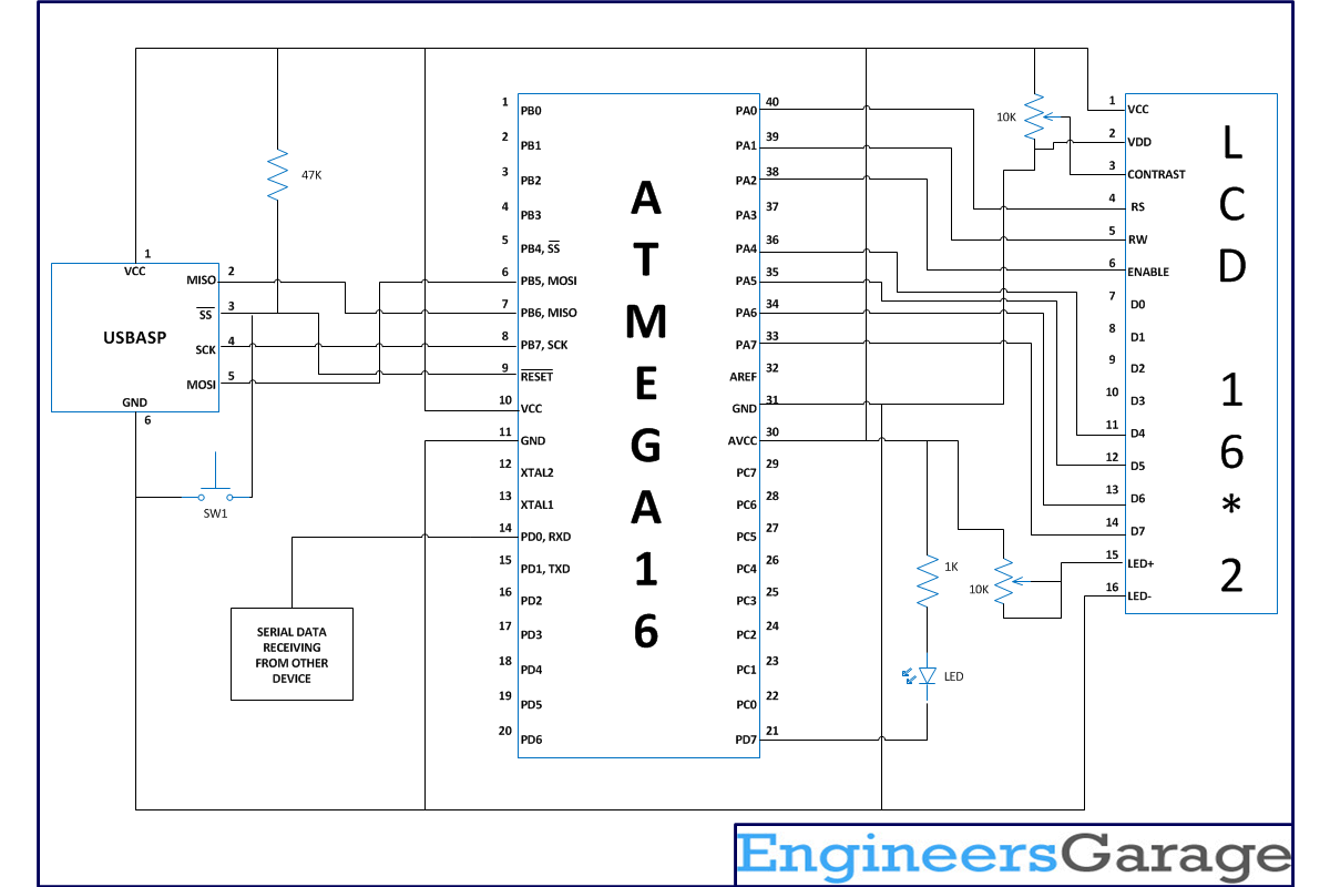 #define F_CPU 8000000#include <avr/io.h>#include <util/delay.h>#include <avr/interrupt.h>#include <avr/eeprom.h>#include "usart.h"void switch_init ( void );int main ( void ){usart_init ();switch_init ();while ( 1 ){PORTD &= 0x7F;_delay_ms ( 2000 );PORTD |= 0x80;while ( 0x0F == ( PINC & 0x0F ) ); // wait till any key is pressed_delay_ms ( 50 );usart_send_string ( "This is a demonstration of single line LCD scrolling display module interfacingby Engineers Garage !!!n" );_delay_ms ( 500 );}}void switch_init ( void ){cli();DDRC &= 0xE0;PORTC = 0xFF;DDRD |= 0x80;PORTD |= 0x80;}#define _USART_H #ifndef F_CPU #define F_CPU 8000000 #endif #define USART_BAUDRATE 9600 #define BAUD_PRESCALE (((F_CPU / (USART_BAUDRATE * 16UL))) - 1) #include<avr/io.h> #include<util/delay.h> #include <stdio.h> void usart_init(); void usart_putch(unsigned char send); unsigned int usart_getch(); void usart_send_string(const char* data); int uart_print(char c, FILE *stream); FILE uart_out = FDEV_SETUP_STREAM(uart_print, NULL, _FDEV_SETUP_WRITE); int uart_print(char c, FILE *stream) { if (c == 'n') uart_print('r', stream); loop_until_bit_is_set(UCSRA, UDRE); UDR = c; return 0; } void usart_init () { UCSRB |= (1<<RXCIE) | (1 << RXEN) | (1 << TXEN); // Turn on the transmission reception .. // circuitry and receiver interrupt UCSRC |= (1 << URSEL) | (1 << UCSZ0) | (1 << UCSZ1); // Use 8-bit character sizes UBRRL = BAUD_PRESCALE; // Load lower 8-bits of the baud rate value.. // into the low byte of the UBRR register UBRRH = (BAUD_PRESCALE >> 8); // Load upper 8-bits of the baud rate value.. // into the high byte of the UBRR register stdout = &uart_out; } void usart_putch(unsigned char send) { while ((UCSRA & (1 << UDRE)) == 0); // Do nothing until UDR is ready.. // for more data to be written to it UDR = send; // Send the byte } unsigned int usart_getch() { while ((UCSRA & (1 << RXC)) == 0); // Do nothing until data have been received and is ready to be read from UDR return(UDR); // return the byte } void usart_send_string(const char* data) { for(; *data; data ++) usart_putch(*data); } #endif