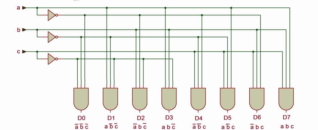 In the encoder example, when D7’s input is ‘1,’ the outputs are ‘a = 1,’ ‘b=1,’ and ‘c=1.’ You can verify other combinations based on the truth table.