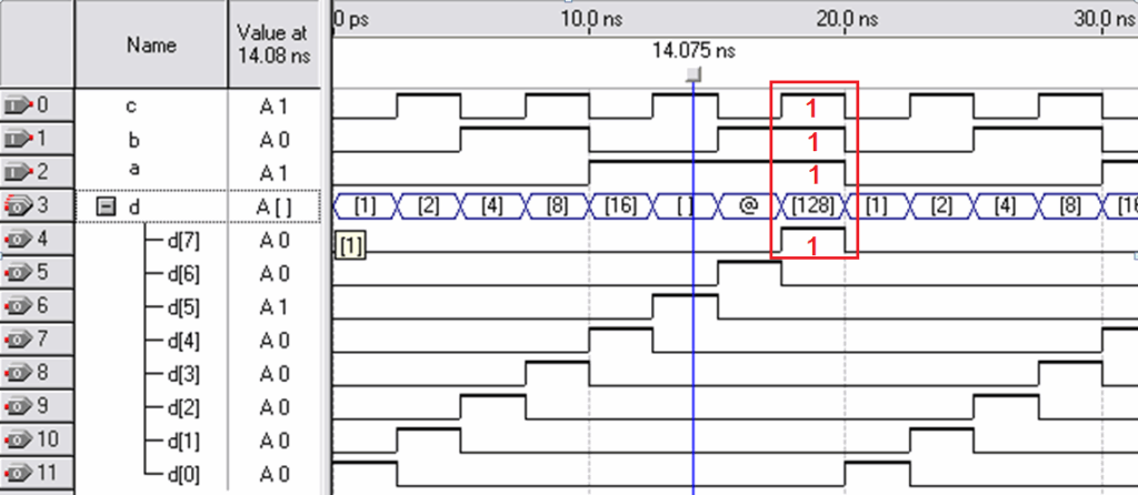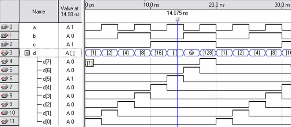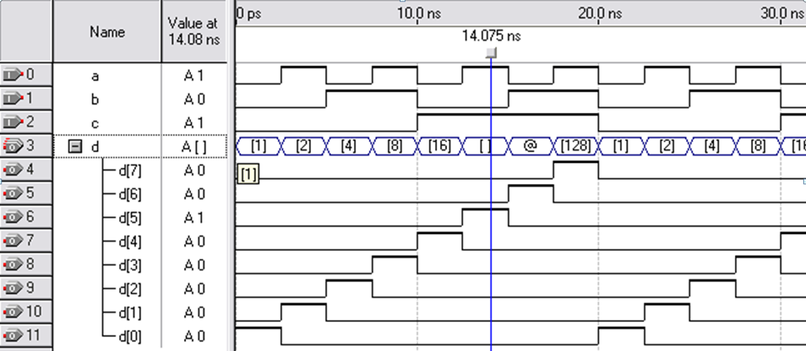 Now, compile the above program, creating a waveform file with all of the necessary inputs and outputs that are listed, and simulate the project.