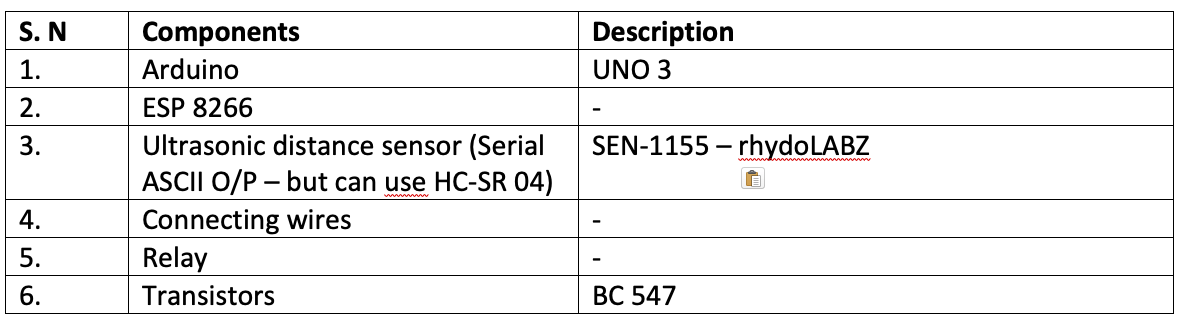 For this project we use Arduino UNO (Atmega 328p), ESP8266, and an ultrasonic distance-measuring sensor (to detect the presence of the vehicle), and the MQTT protocol for communication between devices.