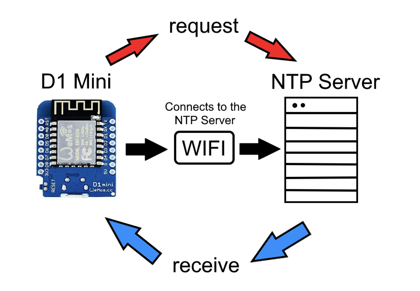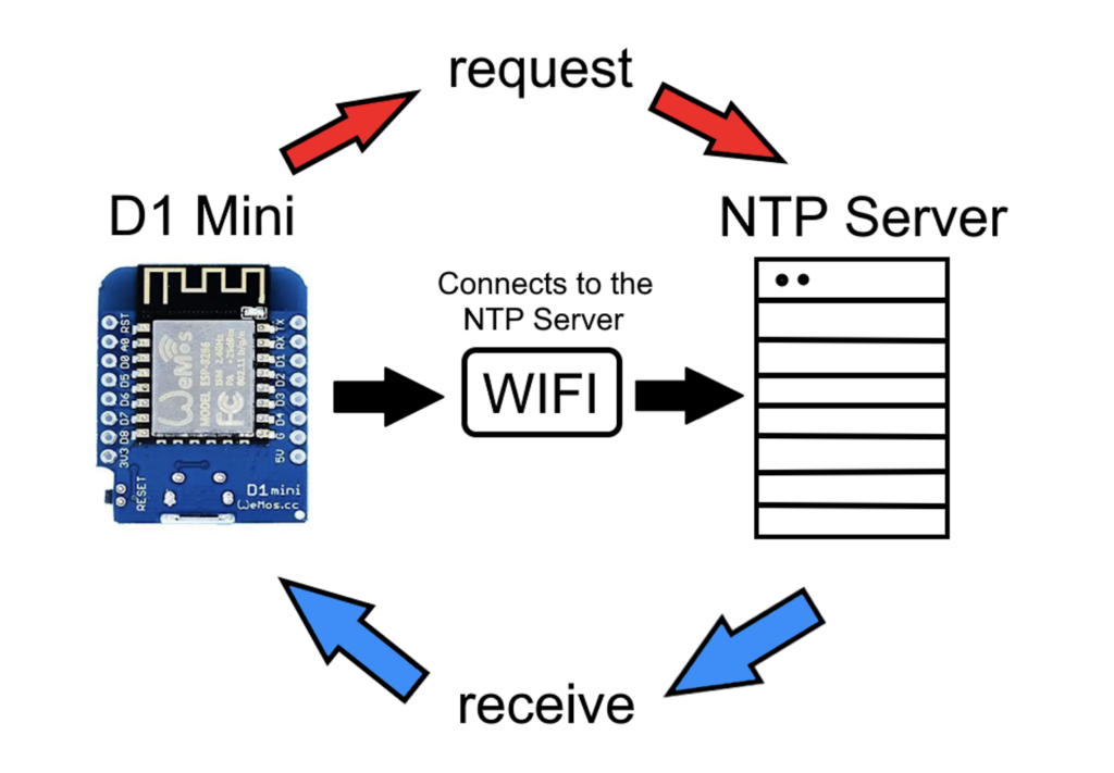 The ESP8266 D1 Mini connects to the network, requesting the time and date from an NTP server. The server then sends this data to the ESP8266 D1 Mini.