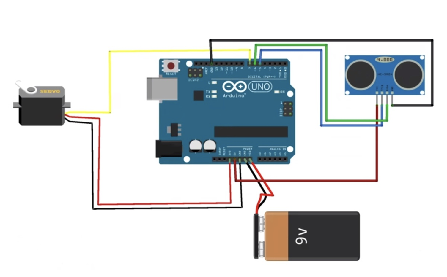 - The ultrasonic sensor’s GND pin with Arduino’s GND pin