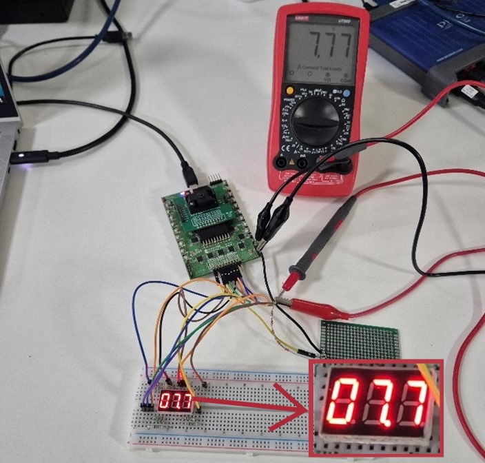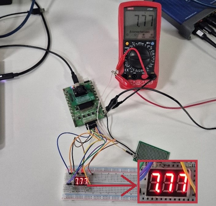 Therefore, when the ADC measures a certain voltage value, the described comparison will point to the corresponding voltage value stored in the Memory Table – 3 consecutively recorded digits, which will dynamically be displayed on the 7-segment display.