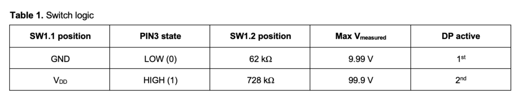 The VIN voltage is applied to PIN 7 through a resistive divider 62 kΩ / 728 kΩ (666 kΩ + 62 kΩ) and 12 kΩ depending on the position of switch SW1. SW1 also affects the maximum allowable voltage (Vmeasured) and decimal point (DP) position.
