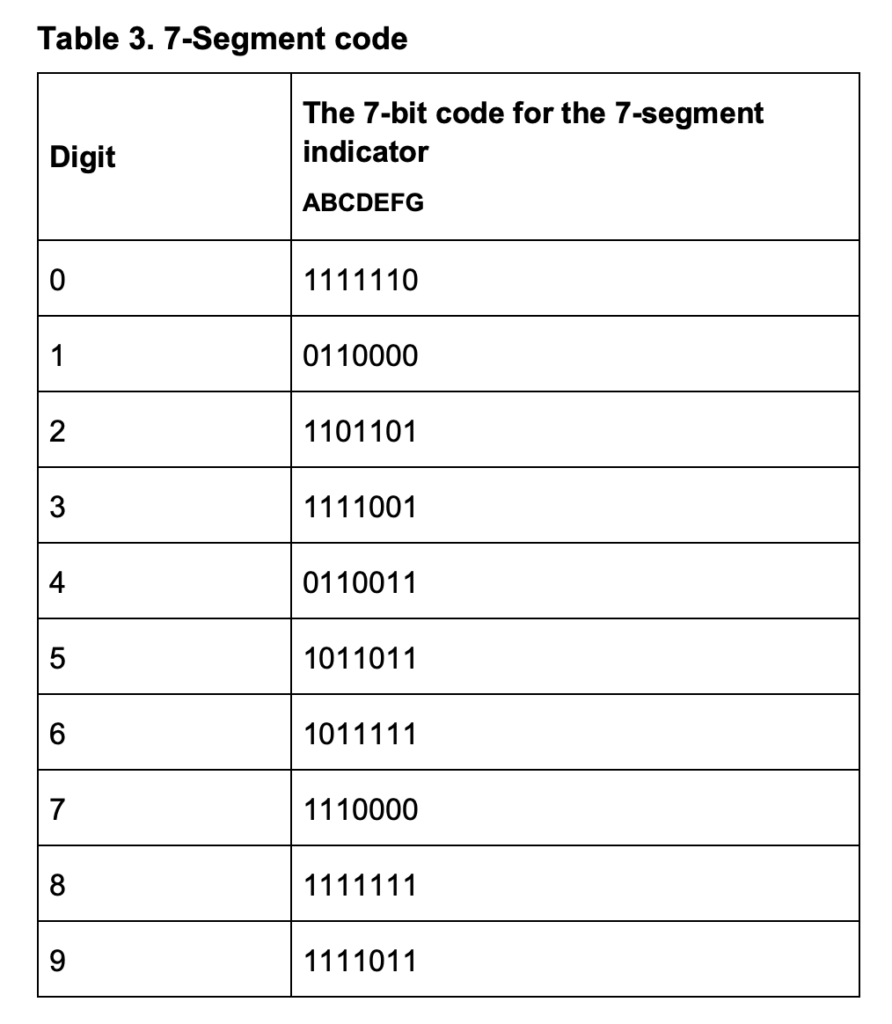 For each column’s digit, a 7-bit binary value is found (m11 – m5), corresponding to the activation of the corresponding digit of the seven-segment display (Table 3).